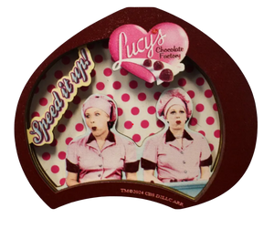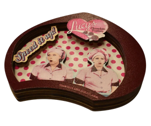 Celebrate the classic I Love Lucy chocolate factory scene with this colorful magnet featuring Lucy and Ethel in their pink uniforms and the phrase “Speed it up!”. A fun, officially licensed collectible perfect for fans of Lucille Ball and timeless TV comedy.